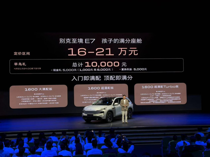 2026年4月10日,别克至境E7公布三款车型设立信息,订价区间为16万-21万元。别克至境E7定位大五座豪华插电混动SUV,交融品牌全新臆想打算言语、越级空间布局、高效混动时候与全场景智能设立,全系标配 42项高价值豪华恬逸设立,均配备真龙插混Pro系统,将于4月22日平稳公布售价并开启录用。