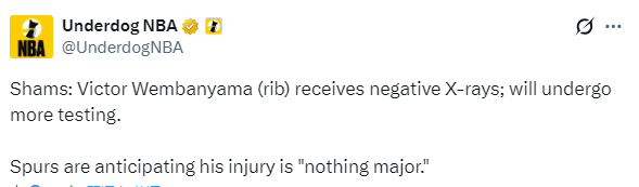 北京本领4月8日,文班亚马的伤情更新,据名记shams报谈,文班亚马肋骨X光查抄恶果为阴性,无结构性损害;据悉,文班将给与进一步查抄,马刺瞻望他的伤势并不严重。