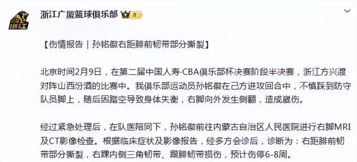 从呼和浩特回到杭州后,孙铭徽对遇到重创的脚踝作念了进一步核查,凭证广厦官方公布的音问,孙铭徽休战技艺详情,只需6-8周技艺便可康复,关于志在卫冕的广厦来说,可谓厄运中的万幸,接下来第二阶段3月中旬才开打,孙铭徽即便休息两月复出,也完全赶得上季后赛。天然如今CBA大部分靠外助明白,广厦领有小巴里-布朗与塔克两名首要逸想极强的小外助,但想要争冠,仍需孙铭徽这么水平的国内球员与外助搭档,首要端拉开空间,防备端分摊小外助的防备压力。
