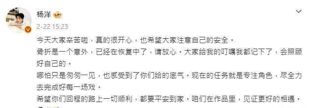 杨洋发文诠释我方骨折仅仅或然,请粉丝无用驰念。